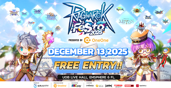 กลับมาอีกครั้งอย่างยิ่งใหญ่กว่าเดิม มหกรรมรวมโลกแห่ง Ragnarok Online ในไทยปี 2025 เตรียมพบกับงานออฟไลน์ที่รวมเกมและคอนเทนต์จากจักรวาล Ragnarok Online ไว้มากที่สุด พร้อมกิจกรรมสุดพิเศษและประสบการณ์เอ็กซ์คลูซีฟสำหรับผู้เล่นทุกคน RAGNAROK FESTA 2025 วันเสาร์ที่ 13 ธันวาคม 2568 เวลา 10:00 น. เป็นต้นไป สถานที่: UOB LIVE HALL, EMSPHERE ชั้น 6 เข้าร่วมงานได้โดยไม่เสียค่าใช้จ่าย Google Map : Click การเดินทาง รถไฟฟ้า BTS สถานีพร้อมพงษ์ทางออก 6, รถไฟฟ้าใต้ดิน MRT สถานีสุขุมวิท รองรับที่จอดรถที่ EMSPHERE EMPORIUM และ EMQUARTIER   งานที่รวมเกมจากจักรวาล Ragnarok Online ไว้มากที่สุดถึง 17 เกมในครั้งเดียวยืนหนึ่งแบบนี้…ที่อื่นไม่มีให้เห็นแน่นอน!! ◄ตัวอย่างแผนผังภายในงาน► …