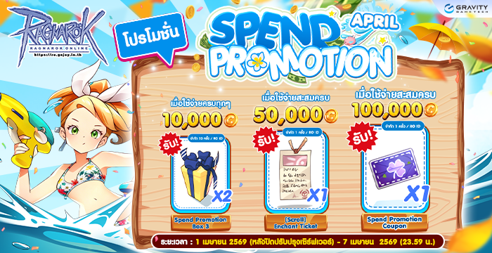 Spend Promotion Coupon โปรโมชั่นใช้จ่ายสะสมครบรับรางวัลพิเศษ Spend Promotion Coupon เลือกรับเซ็ตไอเทมได้เลย ระยะเวลาโปรโมชั่น : 01/04 – 07/04/2026 (23:59 น.) รายละเอียดโปรโมชั่น 1. โปรโมชั่นใช้ Cash Point ครบทุกๆยอดที่กำหนดรับไอเทม 2. เมื่อใช้จ่าย Cash Point ครบทุกๆ 10,000 จะได้รับ Spend Promotion Box 3 จำนวน 2ea (จำกัด 10 ครั้งต่อไอดี) 3. เมื่อใช้จ่าย Cash Point ครบ 50 ,000 จะได้รับ [Scroll] Enchant Ticket จำนวน 1ea (จำกัด 1 ครั้งต่อไอดี) 4. เมื่อใช้จ่าย …
