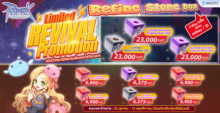 พบกับ Flash Sale ไอเท็มอัพเกรดสุดพิเศษ ต้อนรับกิจกรรมตีบวก ระยะเวลาจำหน่าย : วันที่ 22 ตุลาคม 2568 (หลังปิดปรับปรุงเซิร์ฟเวอร์) ถึง วันที่ 12 พฤศจิกายน 2568 (ก่อนปิดปรับปรุงเซิร์ฟเวอร์) วางจำหน่ายใน CASH SHOP (Limited) HD Elunium Box (30) ราคา 6,900 Cash (Limited) HD Oridecon Box (30) ราคา 6,900 Cash (Limited) HD Bradium Box (30) ราคา 6,375 Cash (Limited) HD Carnium Box (30) ราคา 6,375 Cash (Limited) Enriched …