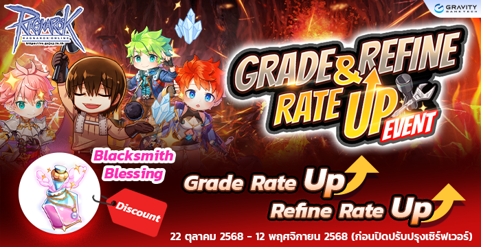 ระยะเวลากิจกรรม : 22 ตุลาคม 2568 – 12 พฤศจิกายน 2568 (ก่อนปิดปรับปรุงเซิร์ฟเวอร์) รายละเอียดกิจกรรม 1. เพิ่มอัตราสำเร็จการตีบวกไอเทมเกราะและอาวุธทุกประเภทภายในระยะเวลากิจกรรม 2. ลดจำนวน Blacksmith Blessing สำหรับการตีบวกไอเทมภายในระยะเวลากิจกรรม 3. เพิ่มอัตราสำเร็จการ Grade  Item ต่างๆภายในระยะเวลากิจกรรม ดูวิธีการ Grade Item (Click)  Official Facebook Page : https://www.facebook.com/RagnarokGGT  Facebook Group Community : https://www.facebook.com/groups/2572821273047219  Youtube Gravity Game Tech : https://www.youtube.com/@GravityGameTech