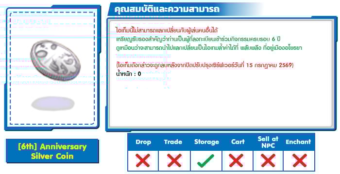 - เมื่อเลือก “ลงทะเบียนเข้าร่วมกิจกรรม” จะได้รับภารกิจพิเศษ ส่งผลให้เมื่อกำจัดมอนสเตอร์ตัวใดๆจะมีโอกาสได้รับไอเทม [6th] Anniversary Silver Coin