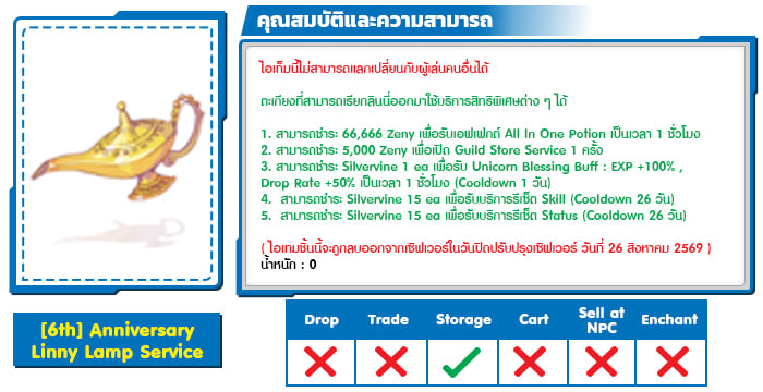 - เมื่อเลือก “บริจาค Silvervine 10ea” จะได้รับ [6th] Anniversary Linny Lamp Service 1ea เพื่อใช้เรียก NPC รับสิทธิพิเศษได้ตลอดกิจกรรม