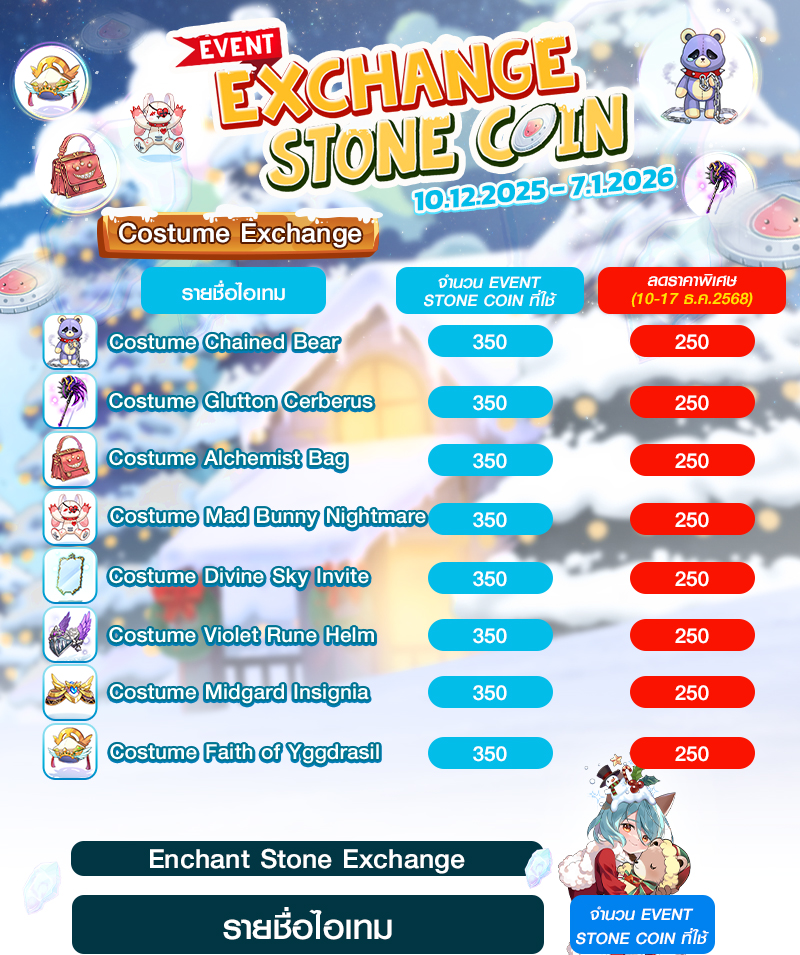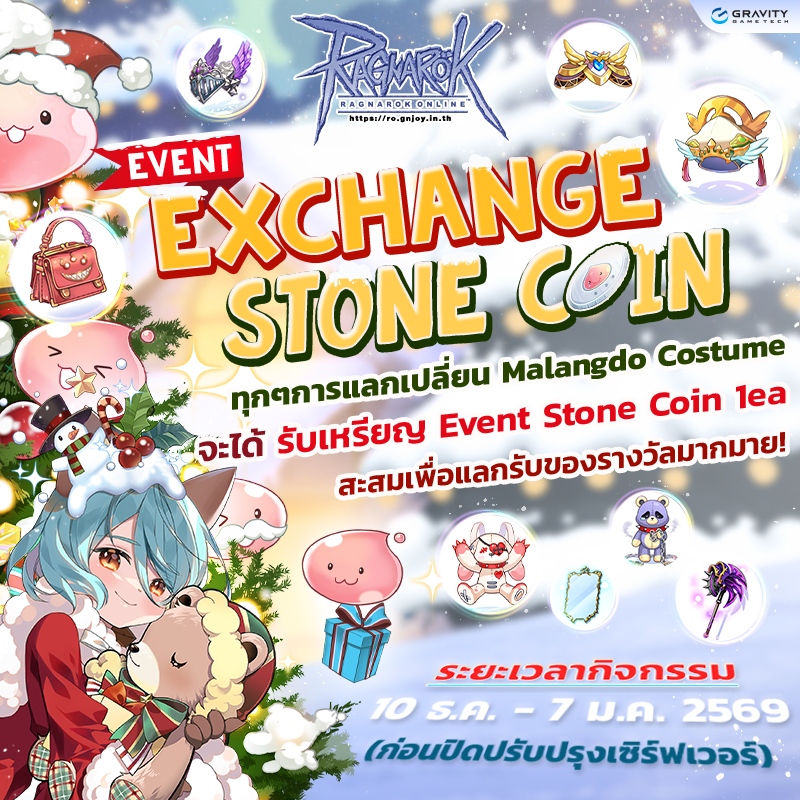 2. เหรียญ Event Stone Coin สามารถนำไปแลกเปลี่ยนหิน Enchant stone และ Limited Costume ได้ที่ NPC Mystery Shop /navi malangdo 122/152