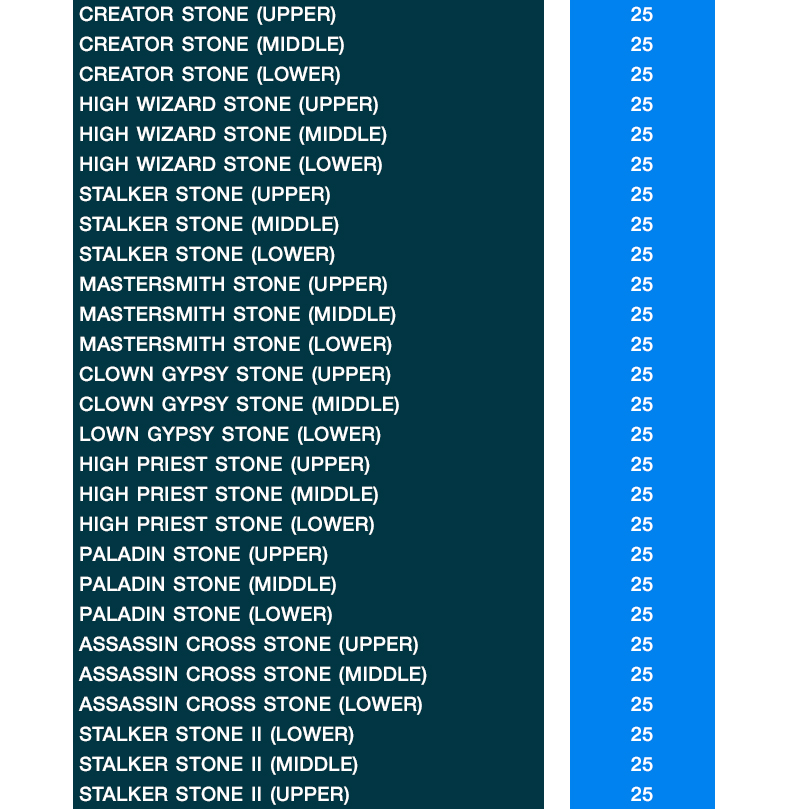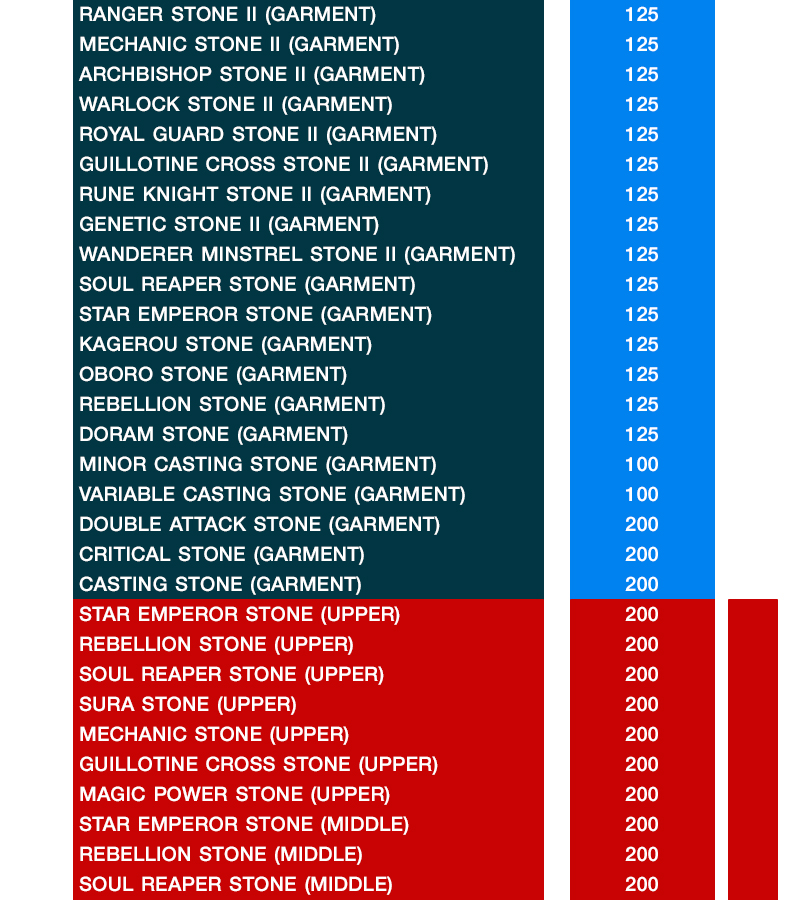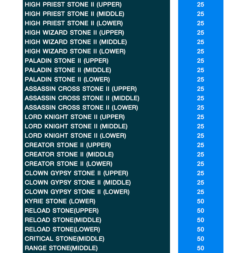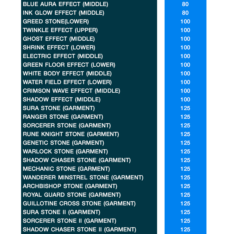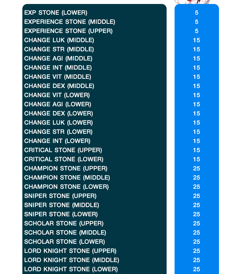 4. ไอเทมที่ผู้เล่นสามารถแลกเปลี่ยนได้เป็นไปตามอัตราตารางด้านล่างนี้