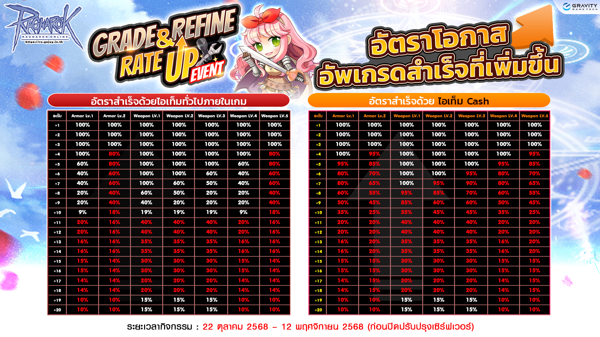 1. เพิ่มอัตราสำเร็จการตีบวกไอเทมเกราะและอาวุธทุกประเภทภายในระยะเวลากิจกรรม