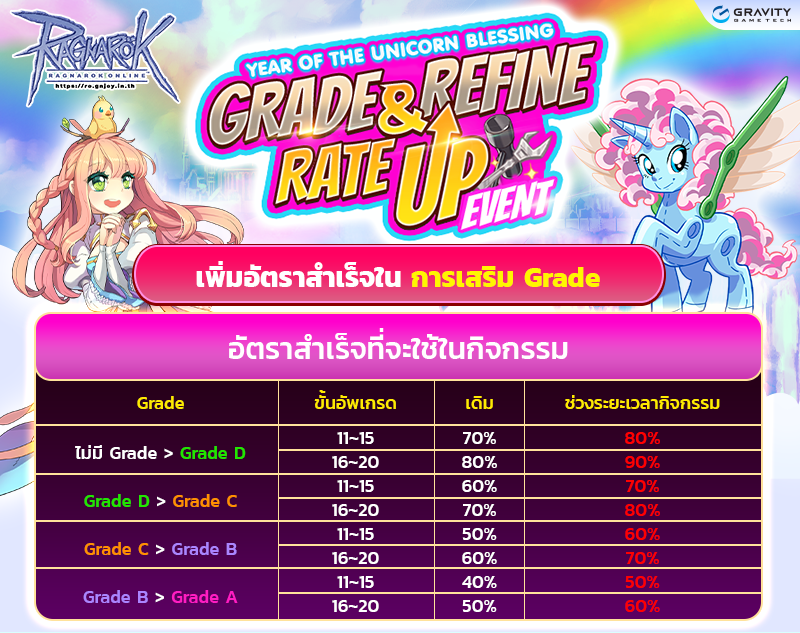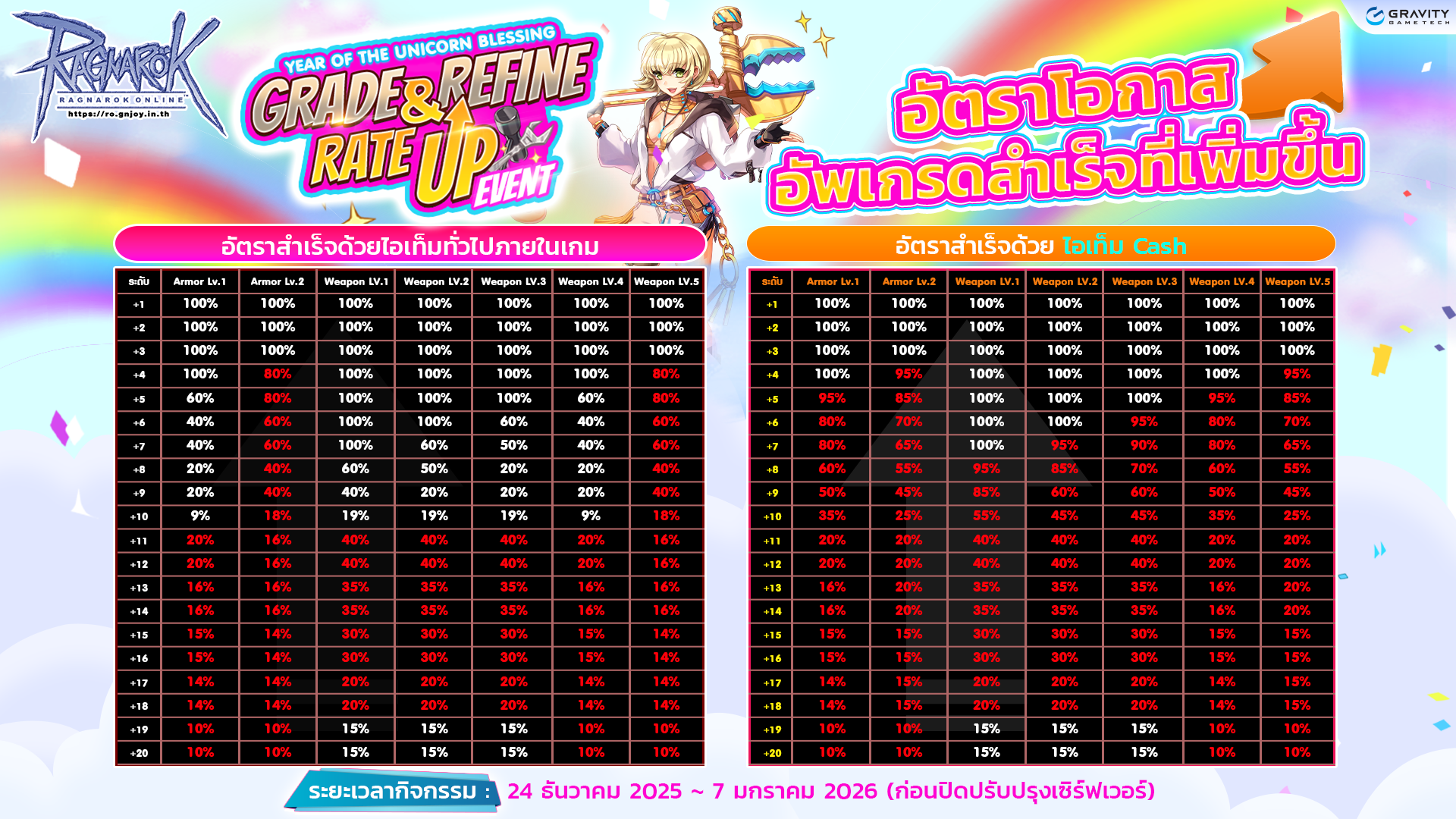 1. เพิ่มอัตราสำเร็จการตีบวกไอเทมเกราะและอาวุธทุกประเภทภายในระยะเวลากิจกรรม