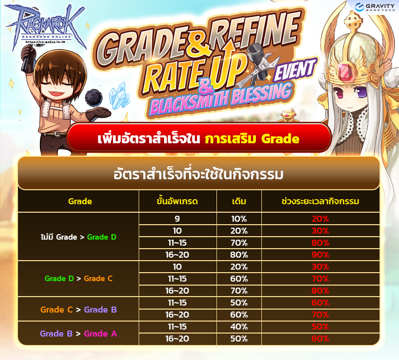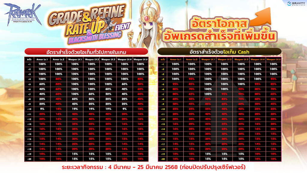 1. เพิ่มอัตราสำเร็จการตีบวกไอเทมเกราะและอาวุธทุกประเภทภายในระยะเวลากิจกรรม