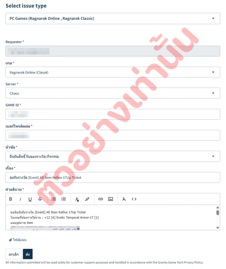 - กรอกข้อมูลให้ครบถ้วน RO ID / เซิร์ฟเวอร์ / ไอเทมที่ต้องการรับสิทธิ์ +17 / รูปภาพไอเทมของตนเอง คล้ายตัวอย่างในภาพ