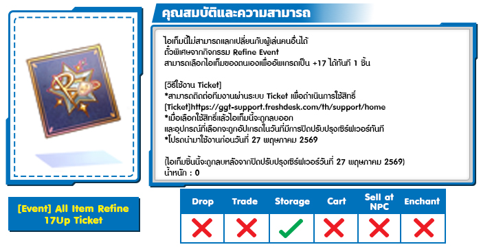 เงื่อนไขการใช้งาน [Event] All Item Refine 17Up Ticket
