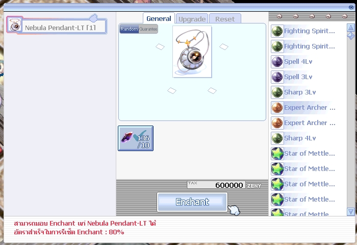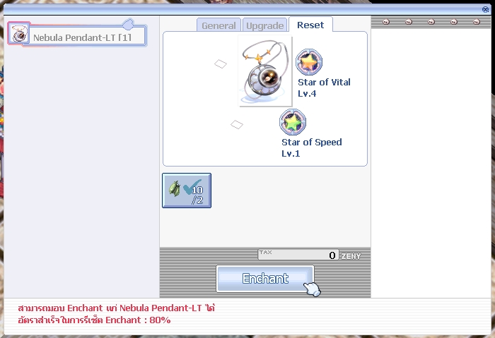 โอกาสสำเร็จ 80% หากล้มเหลวจะสูญเสียวัตถุดิบในการ Reset และได้รับไอเทมคืน