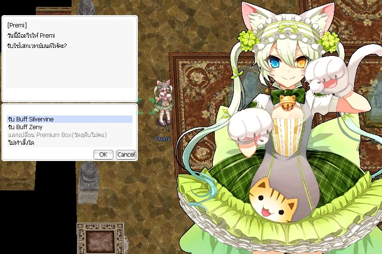เมื่อกดใช้งานไอเทม Premium Service Staff จะเป็นการเรียก NPC Premi ขึ้นมา ให้พูดคุยด้วยจะมีหัวข้อให้เลือกสนทนา