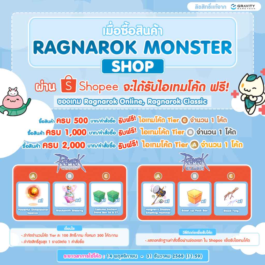 พิเศษ! ซื้อสินค้าผ่าน RO Shop บน Shopee รับฟรีไอเทมโค้ดสุดพิเศษจาก 2 เกมดัง! Ragnarok Online (RO Class4) และ Ragnarok Online Classic (ROC)