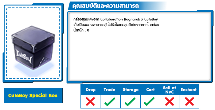 - เมื่อซื้อสินค้า Cute boy ที่ร่วมรายการและชำระเงินสำเร็จครบ 2,000 บาท จะได้รับ Item Code Cute boy Gift Box ทั้งสองเกม (Ragnarok Online, Ragnarok Classic) เกมละ 25ea