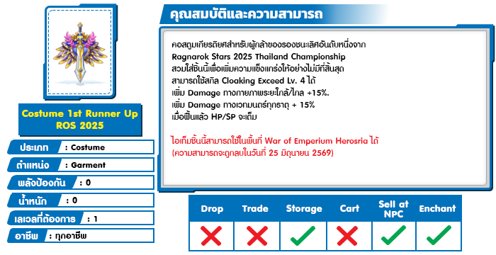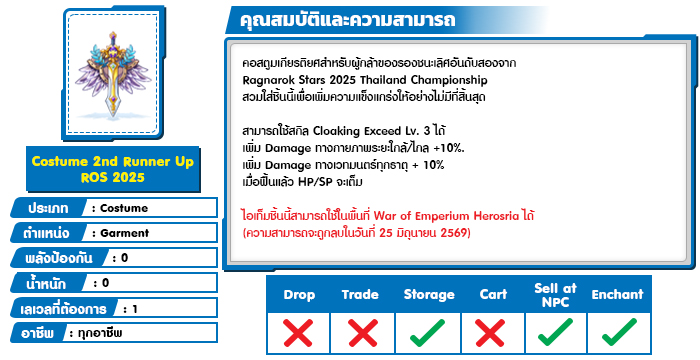 สำหรับนักผจญภัยที่สวมใส่ Costume Champion ROS 2025 Thailand , Costume 1st Runner Up ROS 2025 , Costume 2nd Runner Up ROS 2025