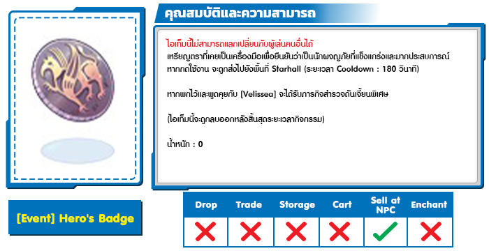 เงื่อนไข : ตัวละครเลเวลตั้งแต่ 200 ขึ้นไป , มี [Event] Hero’s Badge ในครอบครอง