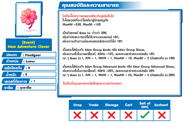 เงื่อนไข : ตัวละครที่มีเลเวลตั้งแต่ 200 ขึ้นไป, มีไอเทม [Event] New Adventure Clover ในตัวละคร (ไม่ต้องสวมใส่)