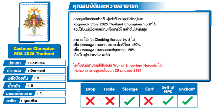 สำหรับนักผจญภัยที่สวมใส่ Costume Champion ROS 2025 Thailand , Costume 1st Runner Up ROS 2025 , Costume 2nd Runner Up ROS 2025