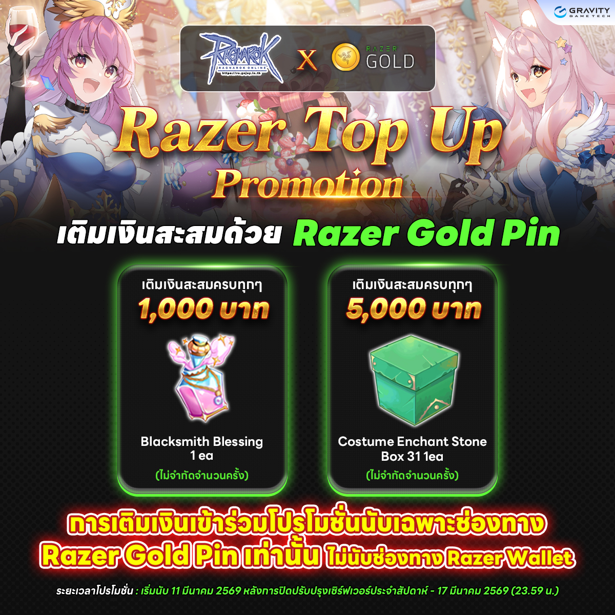 1. โปรโมชั่นเติมเงินสะสมด้วยบัตร Razer Gold Pin ภายในระยะเวลาที่กำหนดเท่านั้น (เริ่มนับ 11 มีนาคม 2569 หลังการปิดปรับปรุงเซิร์ฟเวอร์ประจำสัปดาห์)