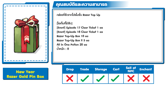 - เมื่อเติมเงินด้วยช่องทาง Razer Gold PIN สะสมครบทุกๆ 5,000 บาทจะได้รับ New Year Razer Gold Pin Box 1ea (จำกัด 2 ครั้ง / ID)