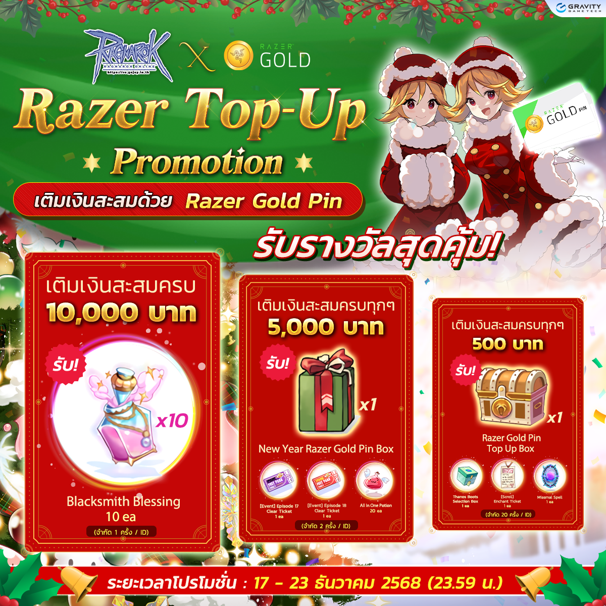 - เมื่อเติมเงินด้วยช่องทาง Razer Gold PIN สะสมครบ 10,000 บาทจะได้รับ Blacksmith Blessing 10ea (จำกัด 1 ครั้ง / ID)