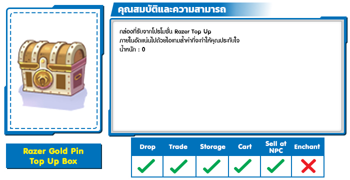 - เมื่อเติมเงินด้วยช่องทาง Razer Gold PIN สะสมครบทุกๆ 500 บาทจะได้รับ Razer Gold Pin Top-Up Box 1ea (จำกัด 20 ครั้ง / ID)