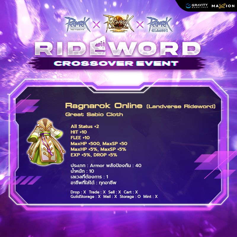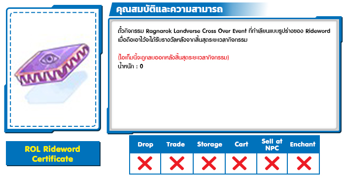 Item Code ของ ROL Rideword สามารถใช้งานได้เฉพาะเซิร์ฟเวอร์ Rideword เท่านั้น