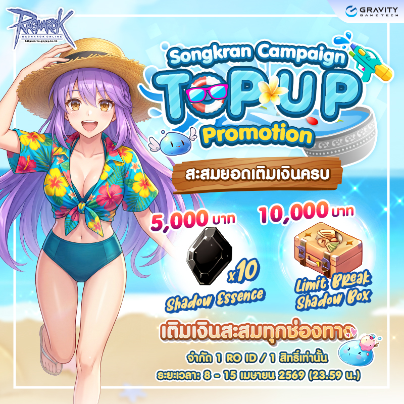 1. โปรโมชั่นเติมเงินสะสมเกม Ragnarok Online ผ่านระบบหน้าเว็บไซต์ทุกช่องทางภายในระยะเวลาที่กำหนด (เริ่มนับ 8 เมษายน 2569 หลังการปิดปรับปรุงเซิร์ฟเวอร์ประจำสัปดาห์)
