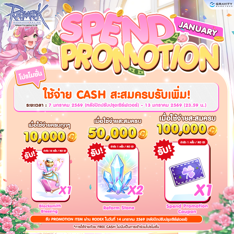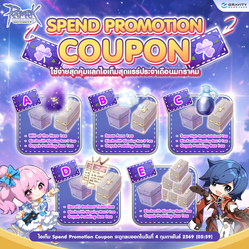 ** Item Spend Promotion Coupon จะถูกลบทุกๆปิดปรับปรุงเซิฟเวอร์ประจำสัปดาห์ของเดือนถัดไป