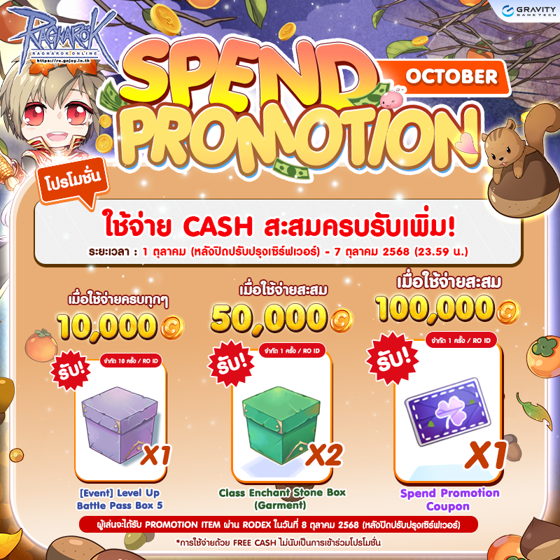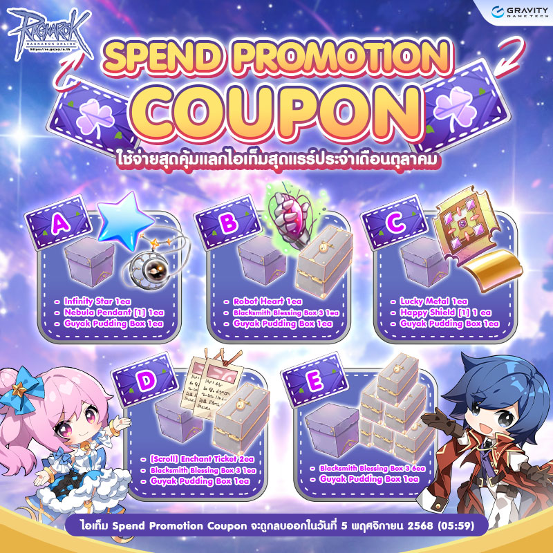 ** Item Spend Promotion Coupon จะถูกลบทุกๆปิดปรับปรุงเซิฟเวอร์ประจำสัปดาห์ของเดือนถัดไป