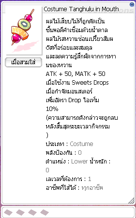 ความสามารถ | ในช่วงระยะเวลากิจกรรม เมื่อสวมใส่ร่วมกับ Costume Mint Chocolate Bonnet จะเพิ่มค่าประสบการณ์ที่ได้รับจากมอนสเตอร์ 5% (ความสามารถของไอเท็มชิ้นนี้จะถูกลบหลังสิ้นสุดกิจกรรม) เมื่อหมดระยะเวลากิจกรรม หากความสัมพันธ์อยู่ในระดับสนิทสนม เพิ่ม EXP ที่ได้รับจากมอนสเตอร์ 1% |