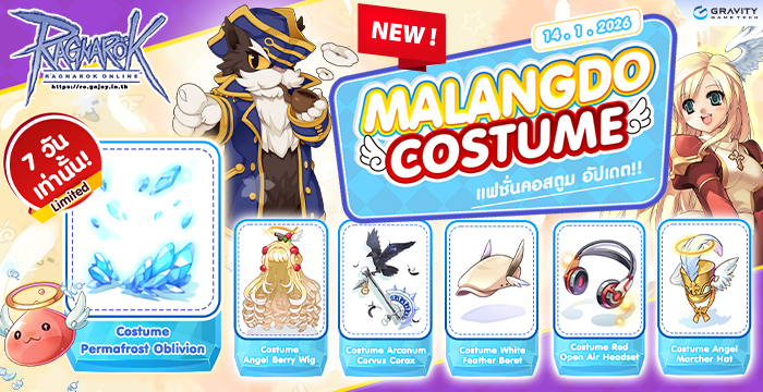 อัพเดทคอสตูมใหม่! พร้อม Costume พิเศษ LIMITED เพียง 7 วันเท่านั้น!! ขั้นตอนและวิธีการเติมเงิน : คลิกที่นี่ ดูข้อมูล Malangdo Costume System ได้ที่นี่ [Limited] Costume Permafrost Oblivion สามารถเปิดรับได้ในวันที่ 14 ม.ค. 2569 (หลังปิดปรับปรุงเซิร์ฟเวอร์) ~ 21 ม.ค. 2569 (ก่อนปิดปรับปรุงเซิร์ฟเวอร์) Costume Angel Berry Wig Costume Arcanum Corvus Corax Set Recommend by DarkLord Costume White Feather Beret Costume Red Open Air Headset Costume Angel Marcher Hat …